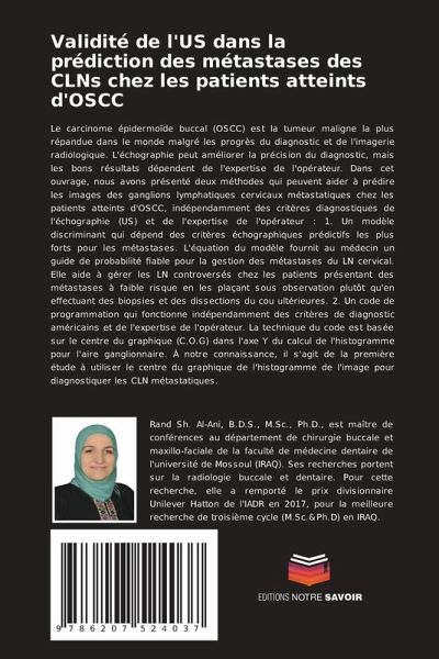 Le carcinome épidermoïde buccal (OSCC) est la tumeur maligne la plus répandue dans le monde malgré les progrès du diagnostic et de l'imagerie radiologique. L'échographie peut améliorer la précision du diagnostic, mais les bons résultats dépendent de l'expertise de l'opérateur. Dans cet ouvrage, nous avons présenté deux méthodes qui peuvent aider à prédire les images des ganglions lymphatiques cervicaux métastatiques chez les patients atteints d'OSCC, indépendamment des critères diagnostiques de l'échographie (US) et de l'expertise de l'opérateur : 1. Un modèle discriminant qui dépend des critères échographiques prédictifs les plus forts pour les métastases. L'équation du modèle fournit au médecin un guide de probabilité fiable pour la gestion des métastases du LN cervical. Elle aide à gérer les LN controversés chez les patients présentant des métastases à faible risque en les plaçant sous observation plutôt qu'en effectuant des biopsies et des dissections du cou ultérieures. 2. Un code de programmation qui fonctionne indépendamment des critères de diagnostic américains et de l'expertise de l'opérateur. La technique du code est basée sur le centre du graphique (C.O.G) dans l'axe Y du calcul de l'histogramme pour l'aire ganglionnaire. À notre connaissance, il s'agit de la première étude à utiliser le centre du graphique de l'histogramme de l'image pour diagnostiquer les CLN métastatiques.