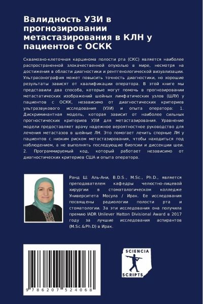 Skwamozno-kletochnaq karcinoma polosti rta (SKS) qwlqetsq naibolee rasprostranennoj zlokachestwennoj opuhol'ü w mire, nesmotrq na dostizheniq w oblasti diagnostiki i rentgenologicheskoj wizualizacii. Ul'trasonografiq mozhet powysit' tochnost' diagnostiki, no horoshie rezul'taty zawisqt ot kwalifikacii operatora. V ätoj knige my predstawili dwa sposoba, kotorye mogut pomoch' w prognozirowanii metastaticheskih izobrazhenij shejnyh limfaticheskih uzlow (ShLU) u pacientow s OSKK, nezawisimo ot diagnosticheskih kriteriew ul'trazwukowogo issledowaniq (UZI) i opyta operatora: 1. Diskriminantnaq model', kotoraq zawisit ot naibolee sil'nyh prognosticheskih kriteriew UZI dlq metastazirowaniq. Urawnenie modeli predostawlqet wrachu nadezhnoe weroqtnostnoe rukowodstwo dlq lecheniq metastazow w shejnye LN. Jeto pomogaet lechit' spornye LN u pacientow s nizkim riskom metastazirowaniq, chtoby nahodit'sq pod nablüdeniem, a ne wypolnqt' posleduüschie biopsii i dissekcii shei. 2. Programmiruemyj kod, kotoryj rabotaet nezawisimo ot diagnosticheskih kriteriew SShA i opyta operatora.