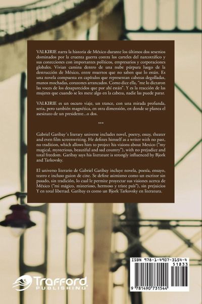 VALKIRIE narra la historia de México durante los últimos dos sexenios dominados por la cruenta guerra contra los carteles del narcotráfico y sus conecciones con importantes políticos, empresarios y corporaciones globales. Vivian camina dentro de una nube púrpura luego de la destrucción de México, entre muertos que no saben que lo están. Es una novela compuesta en capítulos que representan cabezas degolladas, manos mochadas, corazones arrancados. Como dice ella, "me lo dictaron las voces de los desaparecidos que por ahí están". Y es la reacción de las mujeres que cuando se les mete algo en la cabeza, nadie las puede parar. VALKIRIE es un oscuro viaje, un trance, con una mirada profunda, seria, pero también magnética, en otra dimensión, en donde se planea el asesinato de un presidente...o dos. VALKIRIE tells the story of contemporary Mexicös history, specially through the last twelve years dominated by an erratic and strange drug war against the cartels and its connections with important politicians, business men and global corporations. Vivian walks inside a purple cloud after Mexico ceased to exist, walking among mexicans who doesn¿t know they are already dead. Its a novel composed in chapters that represent heads, hands, legs and hearts dismembered. VALKIRIE may be a fiction but its well documented in reality. As Vivian, one of its characters, says, "it¿s written by the voices unheard, by the lost ones, the dissapeared: the testimony of the dead that still walk around us". VALKIRIE its a trip, a trance, a dark tour de force inside the mind of a girl induced by a new and powerful illegal drug in a plot that has to do with the attempt to kill the president...or two.