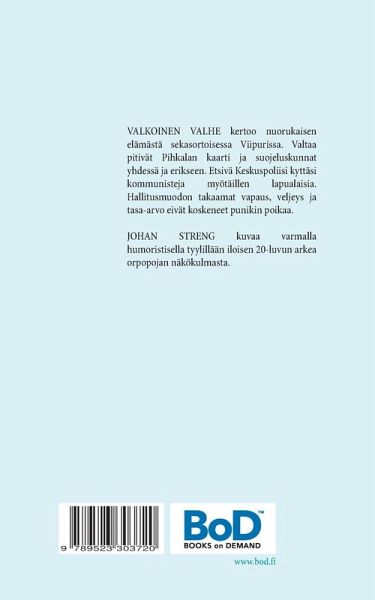 VALKOINEN VALHE kertoo nuorukaisen elämästä sekasortoisessa Viipurissa. Valtaa pitivät Pihkalan kaarti ja suojeluskunnat yhdessä ja erikseen. Etsivä Keskuspoliisi kyttäsi kommunisteja myötäillen lapualaisia. Hallitusmuodon takaamat vapaus, veljeys ja tasa-arvo eivät koskeneet punikin poikaa. JOHAN STRENG kuvaa varmalla humoristisella tyylillään iloisen 20-luvun arkea orpopojan näkökulmasta.