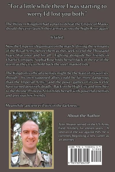 Rage of the Empire! The Western Kingdom had a plan to defeat the Empire of Masks, should they ever launch their armies across the Night River again. It failed. Now the Emperor's legions are on the march, driving the remnants of the Royal Army before them as they seek to end the Thousand Years' War once and for all. Fighting alongside her friends in Charlie Company, Sophia Rose finds herself back in the eye of the storm as they try to hold back the steel-masked tide. The Kingdom's official enemies might be the least of its worries, though. Its own supposed allies could be far more dangerous than the Imperial Army... and the power games of its own elite have turned positively deadly. Back in the High City and now heir to the throne, Princess Arilin finds herself with powerful enemies and precious few friends. Meanwhile, ancient evil stirs in the darkness...