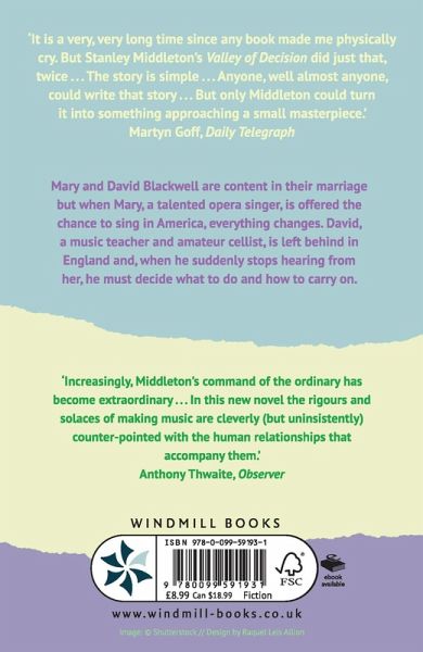 A novel from the Booker-Prize winning author Stanley Middleton. Rejacked and reissued in Windmill. Mary and David Blackwell are content in their marriage but when Mary, a talented opera singer, is offered the chance to sing in America, everything changes. David, a music teacher and amateur cellist, is left behind in England and, when he suddenly stops hearing from her, he must decide how to carry on and what to do. 'It is a very, very long time since any book made me physically cry. But Stanley Middleton's Valley of Decision did just that, twice... The story is simple... Anyone, well almost anyone, could write that story... But only Mr Middleton could turn it into something approaching a small masterpiece.' Martyn Goff, Daily Telegraph 'Increasingly, Middleton's command of the ordinary has become extraordinary... In this new novel the rigours and solaces of making music are cleverly (but uninsistently) counter-pointed with the human relationships that accompany them.' Anthony Thwaite, Observer