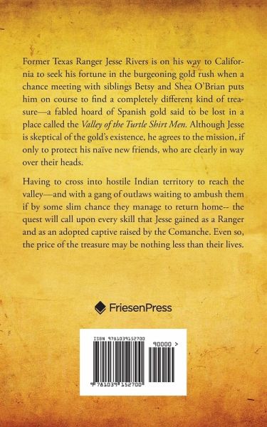Former Texas Ranger Jesse Rivers is on his way to California to seek his fortune in the burgeoning gold rush when a chance meeting with siblings Betsy and Shea O'Brian puts him on course to find a completely different kind of treasure-a fabled hoard of Spanish gold said to be lost in a place called the Valley of the Turtle Shirt Men. Although Jesse is skeptical of the gold's existence, he agrees to the mission, if only to protect his naïve new friends, who are clearly in way over their heads. Having to cross into hostile Indian territory to reach the valley-and with a gang of outlaws waiting to ambush them if by some slim chance they manage to return home-- the quest will call upon every skill that Jesse gained as a Ranger and as an adopted captive raised by the Comanche. Even so, the price of the treasure may be nothing less than their lives.