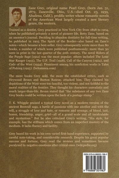 Zane Grey is the master writer of the American Western. The Valley of Wild Horses is a great story full of cowboys, horses, hombres and gun fights. Panhandle Smith, "Pan" for short, was born to a Texas farmer and raised in wide open spaces. His dad bought him his first pony when he was just a spud, and when the cattle herds came by going up the trail, he was in awe of the cowboys, their horses, boots and spurs. The story follows Pan, his family, friends and girl in the wild west. Lawless but full of opportunity. ...( Fred Shaw) About the author: Zane Grey, original name Pearl Grey, (born Jan. 31, 1872, Zanesville, Ohio, U.S.-died Oct. 23, 1939, Altadena, Calif.), prolific writer whose romantic novels of the American West largely created a new literary genre, the western. Trained as a dentist, Grey practiced in New York City from 1898 to 1904, when he published privately a novel of pioneer life, Betty Zane, based on an ancestor's journal. Deciding to abandon dentistry for full-time writing, he published in 1905 The Spirit of the Border-also based on Zane's notes-which became a best-seller. Grey subsequently wrote more than 80 books, a number of which were published posthumously; more than 50 were in print in the last quarter of the 20th century. The novel Riders of the Purple Sage (1912) was the most popular; others included The Lone Star Ranger (1915), The U.P. Trail (1918), Call of the Canyon (1924), and Code of the West (1934). Prominent among his nonfiction works is Tales of Fishing (1925). (britannica.com) The more books Grey sold, the more the established critics, such as Heywood Broun and Burton Rascoe, attacked him. They claimed his depictions of the West were too fanciful, too violent, and not faithful to the moral realities of the frontier. They thought his characters unrealistic and much larger-than-life. Broun stated that "the substance of any two Zane Grey books could be written upon the back of a postage stamp." T. K. Whipple praised a typical Grey novel as a modern version of the ancient Beowulf saga, a battle of passions with one another and with the will, a struggle of love and hate, or remorse and revenge, of blood, lust, honor, friendship, anger, grief-all of a grand scale and all incalculable and mysterious." But he also criticized Grey's writing, "His style, for example, has the stiffness which comes from an imperfect mastery of the medium. It lacks fluency and facility. Grey based his work in his own varied first-hand experience, supported by careful note-taking, and considerable research. Despite his great popular success and fortune, Grey read the reviews and sometimes became paralyzed by negative emotions after critical ones. (wikipedia.org)