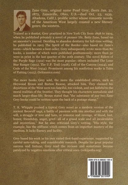 Zane Grey is the master writer of the American Western. The Valley of Wild Horses is a great story full of cowboys, horses, hombres and gun fights. Panhandle Smith, "Pan" for short, was born to a Texas farmer and raised in wide open spaces. His dad bought him his first pony when he was just a spud, and when the cattle herds came by going up the trail, he was in awe of the cowboys, their horses, boots and spurs. The story follows Pan, his family, friends and girl in the wild west. Lawless but full of opportunity. ...( Fred Shaw) About the author: Zane Grey, original name Pearl Grey, (born Jan. 31, 1872, Zanesville, Ohio, U.S.-died Oct. 23, 1939, Altadena, Calif.), prolific writer whose romantic novels of the American West largely created a new literary genre, the western. Trained as a dentist, Grey practiced in New York City from 1898 to 1904, when he published privately a novel of pioneer life, Betty Zane, based on an ancestor's journal. Deciding to abandon dentistry for full-time writing, he published in 1905 The Spirit of the Border-also based on Zane's notes-which became a best-seller. Grey subsequently wrote more than 80 books, a number of which were published posthumously; more than 50 were in print in the last quarter of the 20th century. The novel Riders of the Purple Sage (1912) was the most popular; others included The Lone Star Ranger (1915), The U.P. Trail (1918), Call of the Canyon (1924), and Code of the West (1934). Prominent among his nonfiction works is Tales of Fishing (1925). (britannica.com) The more books Grey sold, the more the established critics, such as Heywood Broun and Burton Rascoe, attacked him. They claimed his depictions of the West were too fanciful, too violent, and not faithful to the moral realities of the frontier. They thought his characters unrealistic and much larger-than-life. Broun stated that "the substance of any two Zane Grey books could be written upon the back of a postage stamp." T. K. Whipple praised a typical Grey novel as a modern version of the ancient Beowulf saga, a battle of passions with one another and with the will, a struggle of love and hate, or remorse and revenge, of blood, lust, honor, friendship, anger, grief-all of a grand scale and all incalculable and mysterious." But he also criticized Grey's writing, "His style, for example, has the stiffness which comes from an imperfect mastery of the medium. It lacks fluency and facility. Grey based his work in his own varied first-hand experience, supported by careful note-taking, and considerable research. Despite his great popular success and fortune, Grey read the reviews and sometimes became paralyzed by negative emotions after critical ones. (wikipedia.org)