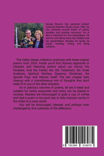 This is the latest edition of the Valley Verses series by author, George Bowers. It is a collection of poems about Jesus Christ, God the Father, Heaven, Hunting, the Outdoors, Seasons, Spiritual Warfare, the Old Testament, and even humorous poems as well.
