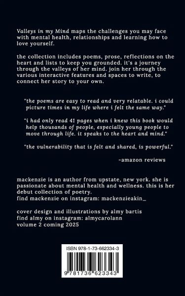 Valleys in my Mind maps the challenges you may face with mental health, relationships and learning how to love yourself. the collection includes poems, prose, reflections on the heart and lists to keep you grounded. it's a journey through the valleys of her mind. join her through the various interactive features and spaces to write, to connect her story to your own. reader reviews: "the poems are easy to read and very relatable. i could picture times in my life where i felt the same way." "i had only read 41 pages when i knew this book would help thousands of people, especially young people to move through life. it speaks to the heart and mind." "the vulnerability that is felt and shared, is powerful."