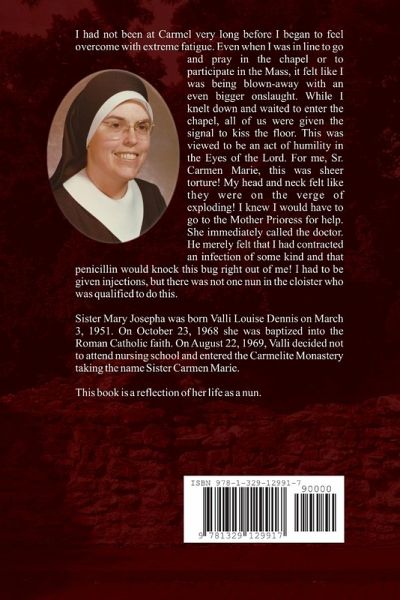 Sister Mary Josepha was born Valli Louise Dennis on March 3, 1951. On October 23, 1968 she was baptized into the Roman Catholic faith. On August 22, 1969, Valli decided not to attend nursing school and entered the Carmelite Monastery taking the name Sister Carmen Marie. This book is a reflection of her life as a nun.