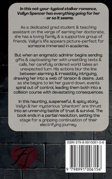 In this not-your-typical stalker romance, Vallyn Spencer has everything going for her-or so it seems. As a dedicated grad student & teaching assistant on the verge of earning her doctorate, she has a loving family & a supportive group of friends. Vallyn's life appears picture-perfect for someone immersed in academia. But when an enigmatic admirer begins sending gifts & captivating her with unsettling texts & calls, her carefully ordered world takes an unexpected turn. His actions blur the line between alarming and irresistibly intriguing, drawing her into a web of tension & desire. Just as she begins to let her guard down, events spiral out of control, leading them both into a collision course with devastating consequences. In this haunting, suspenseful, and spicy story, Vallyn and her mysterious "phantom" are thrust into an unnerving battle of trust & survival. The book ends in a partial resolution, setting the stage for a gripping continuation of their electrifying journey.