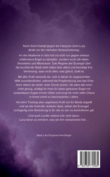 Nach ihrem Kampf gegen die Harpyien steht Lucy direkt vor der nächsten Herausforderung: An der Akademie in Valo hat sie nicht nur gegen weitaus erfahrenere Engel zu kämpfen, sondern auch mit vielen Vorurteilen und Misstrauen. Das Regime der Erzengel über die leuchtende Stadt steht dabei über allem und bestätigt ihre Vermutung, dass nicht alles, was glänzt, gold ist. Mit aller Kraft versucht sie, sich in dieser ihr unbekannten Welt zurechtzufinden, während die Prophezeiung und das Erbe ihres Vaters sie weiter unter Druck setzen. Als wäre das noch nicht genug, schlägt ihr Herz für einen gewissen Engel mit ozeanblauen Augen immer höher und sorgt für noch mehr Chaos in ihrem sonst so beschaulichen Leben. Als beim Training eine ungeheure Kraft von ihr Besitz ergreift und sie die Kontrolle verlieren lässt, sehen die Erzengel schlagartig eine Bedrohung in ihr, die es nun zu kontrollieren gilt. Und auch Lucifer scheut sich nicht davor, Lucy daran zu erinnern, was sie ihm versprochen hat.