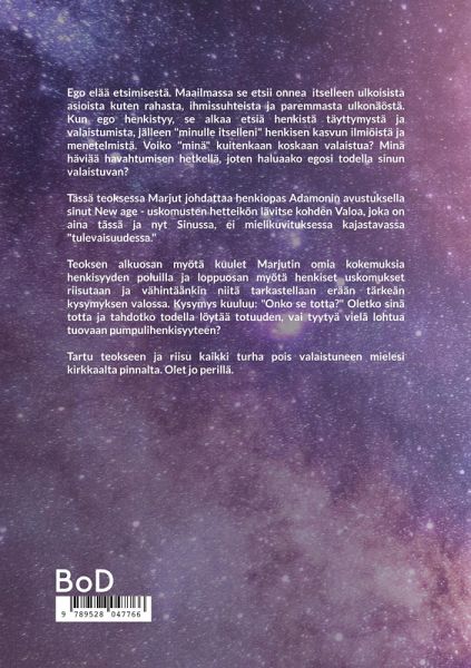 Ego elää etsimisestä. Maailmassa se etsii onnea itselleen ulkoisista asioista kuten rahasta, ihmissuhteista ja paremmasta ulkonäöstä. Kun ego henkistyy, se alkaa etsiä henkistä täyttymystä ja valaistumista, jälleen "minulle itselleni" henkisen kasvun ilmiöistä ja menetelmistä. Voiko "minä" kuitenkaan koskaan valaistua? Minä häviää valaistumisen hetkellä, joten haluaako egosi todella sinun valaistuvan? Tässä teoksessa Marjut johdattaa henkiopas Adamonin avustuksella sinut New age - uskomusten hetteikön lävitse kohden Valoa, joka on aina tässä ja nyt Sinussa, ei mielikuvituksessa kajastavassa "tulevaisuudessa." Teoksen alkuosan myötä kuulet Marjutin omia kokemuksia henkisyyden poluilla ja loppuosan myötä henkiset uskomukset riisutaan ja vähintäänkin niitä tarkastellaan erään tärkeän kysymyksen valossa. Kysymys kuuluu: "Onko se totta?" Oletko sinä totta ja tahdotko todella löytää totuuden, vai tyytyä vielä lohtua tuovaan pumpulihenkisyyteen? Tartu teokseen ja riisu kaikki turha pois valaistuneen mielesi kirkkaalta pinnalta. Olet jo perillä
