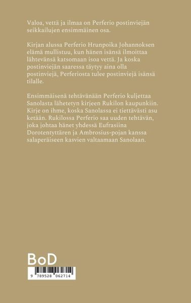 Valoa, vettä ja ilmaa on Perferio postinviejän seikkailujen ensimmäinen osa. Kirjan alussa Per-ferio Hrunpoika Johannoksen elämä mullistuu, kun hänen isänsä ilmoittaa lähtevänsä katso-maan isoa vettä. Ja koska postinviejän saaressa täytyy aina olla postinviejä, Perferiosta tulee postinviejä isänsä tilalle. Ensimmäisenä tehtävänään Perferio kuljettaa Sanolasta lähetetyn kir-jeen Rukilon kaupunkiin. Kirje on ihme, koska Sanolassa ei tiettävästi asu ketään. Rukilossa Perferio saa uuden tehtävän, joka johtaa hänet yhdessä Eufrasiina Dorotentyttären ja Ambro-sius-pojan kanssa salaperäiseen kasvien valtaamaan Sanolaan.