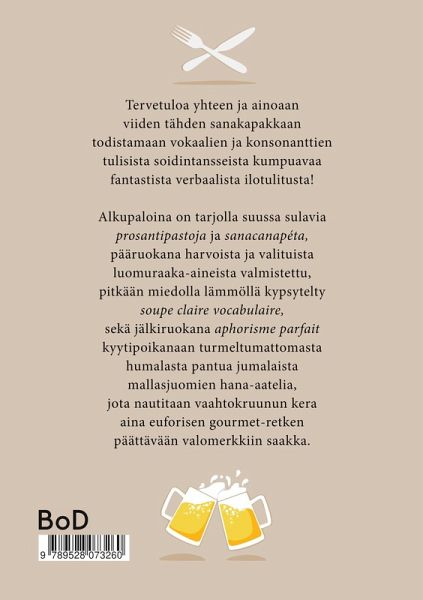 Tervetuloa yhteen ja ainoaan viiden tähden sanakapakkaan todistamaan vokaalien ja konsonanttien tulisista soidintansseista kumpuavaa fantastista verbaalista ilotulitusta! Alkupaloina on tarjolla suussa sulavia prosantipastoja ja sanacanapéta, pääruokana harvoista ja valituista luomuraaka-aineista valmistettu, pitkään miedolla lämmöllä kypsytelty soupe claire vocabulaire, sekä jälkiruokana aphorisme parfait kyytipoikanaan turmeltumattomasta humalasta pantua jumalaista mallasjuomien hana-aatelia, jota nautitaan vaahtokruunun kera aina euforisen gourmet-retken päättävään valomerkkiin saakka.