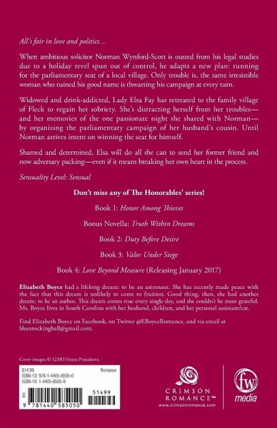 All's fair in love and politics... When ambitious solicitor Norman Wynford-Scott is ousted from his legal studies due to a holiday revel spun out of control, he adapts a new plan of running for the Parliament seat of a local village. Only trouble is, the same irresistible woman who ruined his good name is thwarting his campaign at every turn. Widowed and drink-addicted, Lady Elsa Fay has retreated to the family village of Fleck to regain her sobriety. She's distracting herself from her troubles--and her memories of the one passionate night she shared with Norman--by organizing the Parliament campaign of her husband's cousin. Until Norman arrives intent on winning the seat for himself. Shamed and determined, Elsa will do all she can to send her former friend and now adversary packing--even if it means breaking her own heart in the process. Sensuality Level: Sensual