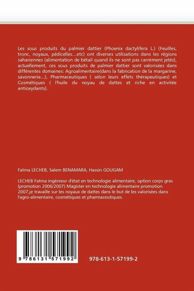 Les sous produits du palmier dattier (Phoenix dactylifera L.) (Feuilles, tronc, noyaux, pédicelles etc) ont diverses utilisations dans les régions sahariennes (alimentation de bétail quand ils ne sont pas carrément jetés), actuellement, ces sous produits de palmier dattier sont valorisées dans différentes domaines: Agroalimentaire(dans la fabrication de la margarine, savonnerie...), Pharmaceutiques ( selon leurs effets thérapeutiques) et Cosmétiques ( l'huile du noyau de dattes et riche en activitée antioxydants).