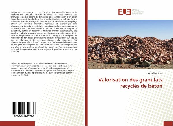 L'objet de cet ouvrage est sur l'analyse des caractéristiques et le réemploi des granulats recyclés de béton. En effet, valoriser ces granulats issus des bétons de démolition pour la fabrication d'un béton hydraulique peut étendre leur domaine d'utilisation actuel. Après une quinzaine d'années d'usage, il apparaît que les matériaux de recyclage offrent une véritable alternative technique et économique dans plusieurs chantiers. La diversité des matériaux produits, conséquence de la diversité des "matières premières" et des différentes techniques de traitement, permet de répondre à un large éventail d'applications, des simples remblais jusqu'aux assises de chaussées à trafic lourd. Cette valorisation présente un intérêt d'ordre économique. Ce réemploi des matériaux de démolition pourrait être envisagé directement sur site ou sur les plateformes de recyclage chargées du traitement. Ces plateformes pourraient alors s'occuper de la fabrication de béton à base de ces granulats recyclés. La diminution des coûts de transports des granulats et des déchets de démolition constitue l'enjeu économique principal, les granulats n'étant pas toujours disponibles à proximité des chantiers.