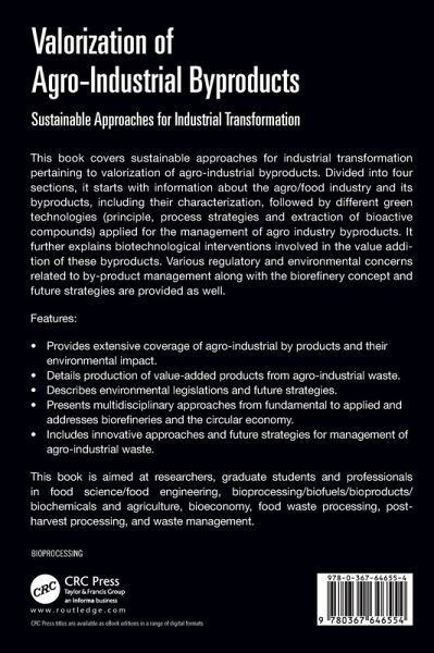 This book covers sustainable approaches for industrial transformation pertaining to valorization of agro-industrial byproducts. Divided into four sections, it starts with information about the agro/food industry and its byproducts, including their characterization, followed by different green technologies (principle, process strategies and extraction of bioactive compounds) applied for the management of agro industry byproducts. It further explains biotechnological interventions involved in the value addition of these byproducts. Various regulatory and environmental concerns related to by-product management along with biorefinery concept and future strategies are provided as well. Features: Provides extensive coverage of agro-industrial by products and their environmental impact Details production of value-added products from agro-industrial waste Describes environmental legislations and future strategies Presents multidisciplinary approaches from fundamental to applied and addresses the biorefinery and circular economy Includes innovative approaches and future strategies for management of agro-industrial waste This book is aimed at researchers, graduate students and professionals in food science/food engineering, bioprocessing/biofuels/bioproducts/biochemicals and agriculture, bioeconomy, food waste processing, post-harvest processing, and waste management.