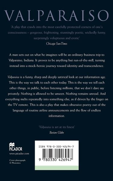 In Valparaiso, a breathtaking play from Don DeLillo, a man sets out on what he imagines will be an ordinary business trip to Valparaiso, Indiana. It proves to be anything but run-of-the-mill, turning instead into a mock-heroic journey toward identity and transcendence. Valparaiso is a funny, sharp and deeply satirical look at our information age. This is the way we talk to each other today. This is the way we tell each other things, in public, before listening millions, that we don't dare say privately. Nothing is allowed to be unseen. Nothing remains unread. And everything melts repeatedly into something else, as if driven by the finger on the TV remote. This is also a play that makes obsessive poetry out of the language of routine airline announcements and the flow of endless information.