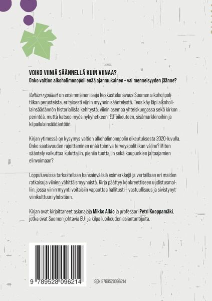 Valtion rypäleet on ensimmäinen laaja keskustelunavaus Suomen alkoholipolitiikan perusteista, erityisesti viinin myynnin sääntelystä. Teos käy läpi alkoholilainsäädännön historiallista kehitystä, viinin asemaa yhteiskunnassa sekä kirkon perintöä, mutta katsoo myös nykyhetkeen: EU-oikeuteen, sisämarkkinoihin ja kilpailulainsäädäntöön. Kirjan ytimessä on kysymys valtion alkoholimonopolin oikeutuksesta 2020-luvulla. Onko saatavuuden rajoittaminen enää toimiva terveyspolitiikan väline? Miten sääntely vaikuttaa kuluttajiin, pieniin tuottajiin sekä kaupunkien ja taajamien elinvoimaan? Loppuluvuissa tarkastellaan kansainvälisiä esimerkkejä ja vertaillaan eri maiden ratkaisuja viinien vähittäismyynnistä. Kirja päättyy konkreettiseen uudistusmalliin, jossa viinin myynti voitaisiin vapauttaa hallitusti - vastuullisuus ja sivistynyt viinikulttuuri yhdistäen.