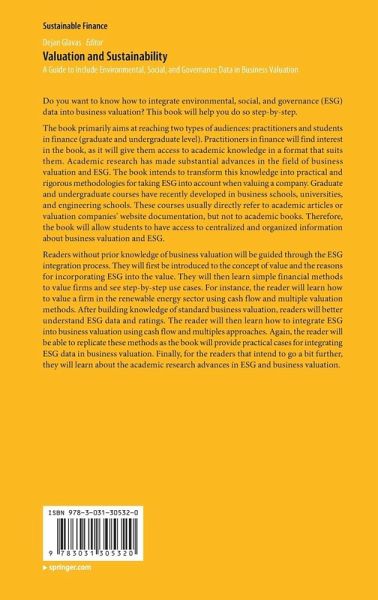 Readers without prior knowledge of business valuation will be guided through the ESG integration process. They will first be introduced to the concept of value and the reasons for incorporating ESG into the value. They will then learn simple financial methods to value firms and see step-by-step use cases. For instance, the reader will learn how to value a firm in the renewable energy sector using cash flow and multiple valuation methods. After building knowledge of standard business valuation, readers will better understand ESG data and ratings. The reader will then learn how to integrate ESG into business valuation using cash flow and multiples approaches. Again, the reader will be able to replicate these methods as the book will provide practical cases for integrating ESG data in business valuation. Finally, for the readers that intend to go a bit further, they will learn about the academic research advances in ESG andbusinessvaluation.