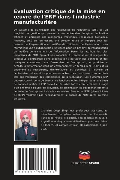 Un système de planification des ressources de l'entreprise (ERP) est un progiciel de gestion qui permet à une entreprise de gérer l'utilisation efficace et efficiente des ressources (matériaux, ressources humaines, finances, etc.) en fournissant une solution totale et intégrée pour les besoins de l'organisation en matière de traitement de l'information. ) en fournissant une solution totale et intégrée pour les besoins de l'organisation en matière de traitement de l'information. Parmi les attributs les plus importants de l'ERP figurent ses capacités à : automatiser et intégrer les processus d'entreprise d'une organisation ; partager des données et des pratiques communes dans l'ensemble de l'entreprise ; et produire et accéder à l'information dans un environnement en temps réel. L'ERP est un ensemble de ressources, d'informations et d'activités à l'échelle de l'entreprise, nécessaires pour mener à bien des processus commerciaux tels que l'exécution des commandes ou la facturation. Les systèmes ERP peuvent couvrir un large éventail de fonctions et les intégrer dans une base de données unifiée. L'ERP prévoit et équilibre l'offre et la demande. Il s'agit d'un ensemble d'outils de prévision, de planification et d'ordonnancement à l'échelle de l'entreprise. Une mise en oeuvre réussie de l'ERP (phase initiale de l'ERP) n'entraîne pas nécessairement le succès de l'ERP après sa mise en oeuvre.