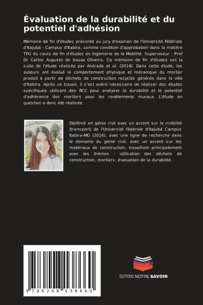 Mémoire de fin d'études présenté au jury d'examen de l'Université Fédérale d'Itajubá - Campus d'Itabira, comme condition d'approbation dans la matière TFG du cours de fin d'études en Ingénierie de la Mobilité. Superviseur : Prof Dr Carlos Augusto de Souza Oliveira. Ce mémoire de fin d'études est la suite de l'étude réalisée par Andrade et al. (2014). Dans cette étude, les auteurs ont évalué le comportement physique et mécanique du mortier produit à partir de déchets de construction recyclés générés dans la ville d'Itabira. Après ce travail, il s'est avéré nécessaire de réaliser des études spécifiques utilisant des RCC pour analyser la durabilité et le potentiel d'adhérence des mortiers pour les revêtements muraux. L'étude en question a donc été réalisée.
