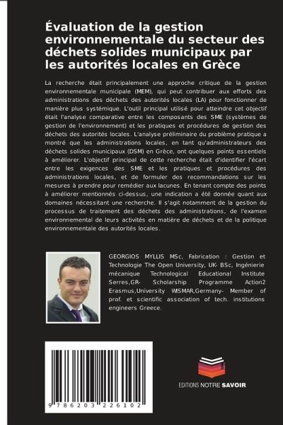 La recherche était principalement une approche critique de la gestion environnementale municipale (MEM), qui peut contribuer aux efforts des administrations des déchets des autorités locales (LA) pour fonctionner de manière plus systémique. L'outil principal utilisé pour atteindre cet objectif était l'analyse comparative entre les composants des SME (systèmes de gestion de l'environnement) et les pratiques et procédures de gestion des déchets des autorités locales. L'analyse préliminaire du problème pratique a montré que les administrations locales, en tant qu'administrateurs des déchets solides municipaux (DSM) en Grèce, ont quelques points essentiels à améliorer. L'objectif principal de cette recherche était d'identifier l'écart entre les exigences des SME et les pratiques et procédures des administrations locales, et de formuler des recommandations sur les mesures à prendre pour remédier aux lacunes. En tenant compte des points à améliorer mentionnés ci-dessus, une indication a été donnée quant aux domaines nécessitant une recherche. Il s'agit notamment de la gestion du processus de traitement des déchets des administrations, de l'examen environnemental de leurs activités en matière de déchets et de la politique environnementale des autorités locales.