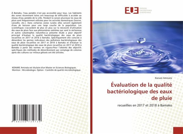 À Bamako, l'eau potable n'est pas accessible pour tous. Les habitants des zones récemment loties ont beaucoup de difficultés à accéder au réseau d'eau potable de la ville. Pendant la saison pluvieuse les eaux de pluie sont fréquemment utilisées pour les activités domestiques (lessive, vaisselle, etc.). Dans certaines zones rurales elles servent également d'eau de boisson pour une large couche de la population. Les scientifiques s'accordent de plus en plus sur la nécessité d'utilisation des eaux de pluie face aux phénomènes extrêmes qui sont la sécheresse et autres catastrophes naturelles.La présente étude a pour objectif principal d'évaluer la qualité bactériologique des eaux de pluie recueillies en 2017 et 2018 à Bamako. Spécifiquement elle consiste à dénombrer les germes indicateurs des pollutions bactériologiques des eaux de pluie recueillies en 2017 et 2018 à Bamako et d'évaluer la qualité bactériologique des eaux de pluie recueillies en 2017 et 2018 à Bamako à partir des normes en vigueur.Pour l'atteinte des objectifs spécifiques des méthodes de dénombrement par comptage de colonies après des cultures sur milieux gélosés ont été utilisées.