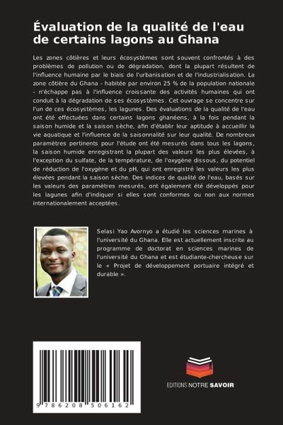 Les zones côtières et leurs écosystèmes sont souvent confrontés à des problèmes de pollution ou de dégradation, dont la plupart résultent de l'influence humaine par le biais de l'urbanisation et de l'industrialisation. La zone côtière du Ghana - habitée par environ 25 % de la population nationale - n'échappe pas à l'influence croissante des activités humaines qui ont conduit à la dégradation de ses écosystèmes. Cet ouvrage se concentre sur l'un de ces écosystèmes, les lagunes. Des évaluations de la qualité de l'eau ont été effectuées dans certains lagons ghanéens, à la fois pendant la saison humide et la saison sèche, afin d'établir leur aptitude à accueillir la vie aquatique et l'influence de la saisonnalité sur leur qualité. De nombreux paramètres pertinents pour l'étude ont été mesurés dans tous les lagons, la saison humide enregistrant la plupart des valeurs les plus élevées, à l'exception du sulfate, de la température, de l'oxygène dissous, du potentiel de réduction de l'oxygène et du pH, qui ont enregistré les valeurs les plus élevées pendant la saison sèche. Des indices de qualité de l'eau, basés sur les valeurs des paramètres mesurés, ont également été développés pour les lagunes afin d'indiquer si elles sont conformes ou non aux normes internationalement acceptées.