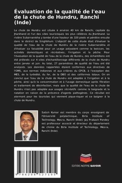 La chute de Hundru est située à environ 40 km de Ranchi, capitale du Jharkhand et l'un des sites touristiques les plus célèbres du Jharkhand. La rivière Subarnarekha y tombe d'une hauteur de 320 pieds et pénètre ensuite dans le district de Singhbhum. L'objectif de cette étude était d'évaluer la qualité de l'eau de la chute de Hundru de la rivière Subarnarekha et d'évaluer sa faisabilité pour un usage polyvalent comme la boisson, les activités domestiques et récréatives, l'irrigation et la pêche. Pour l'évaluation de la qualité de l'eau de la chute de Hundru, des échantillons ont été prélevés sur 4 sites d'échantillonnage différents de la chute de Hundru entre janvier et juin. Au total, 27 paramètres de qualité de l'eau ont été analysés. Les données rapportées étaient conformes aux directives de l'OMS, aux normes indiennes et aux critères du CPCB, à l'exception des MES, de la turbidité, du fer, de la DBO et des coliformes totaux. On en conclut que l'eau de la chute de Hundru est adaptée à l'irrigation et à la pêche, ainsi qu'à la consommation et à l'usage domestique après filtration et traitement de désinfection, mais que la qualité de l'eau de la chute de Hundru n'est pas adaptée aux usages récréatifs comme la baignade et la natation en raison de la présence d'agents pathogènes. Ce résultat est alarmant pour les touristes qui viennent pique-niquer et se baigner à la chute de Hundru.