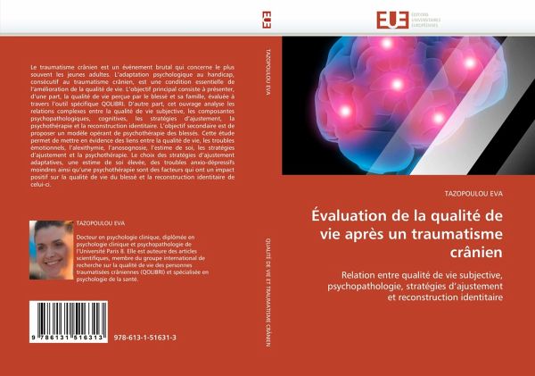 Le traumatisme crânien est un événement brutal qui concerne le plus souvent les jeunes adultes. L'adaptation psychologique au handicap, consécutif au traumatisme crânien, est une condition essentielle de l'amélioration de la qualité de vie. L'objectif principal consiste à présenter, d'une part, la qualité de vie perçue par le blessé et sa famille, évaluée à travers l'outil spécifique QOLIBRI. D'autre part, cet ouvrage analyse les relations complexes entre la qualité de vie subjective, les composantes psychopathologiques, cognitives, les stratégies d'ajustement, la psychothérapie et la reconstruction identitaire. L'objectif secondaire est de proposer un modèle opérant de psychothérapie des blessés. Cette étude permet de mettre en évidence des liens entre la qualité de vie, les troubles émotionnels, l'alexithymie, l'anosognosie, l'estime de soi, les stratégies d'ajustement et la psychothérapie. Le choix des stratégies d'ajustement adaptatives, une estime de soi élevée, des troubles anxio-dépressifs moindres ainsi qu'une psychothérapie sont des facteurs qui ont un impact positif sur la qualité de vie du blessé et la reconstruction identitaire de celui-ci.
