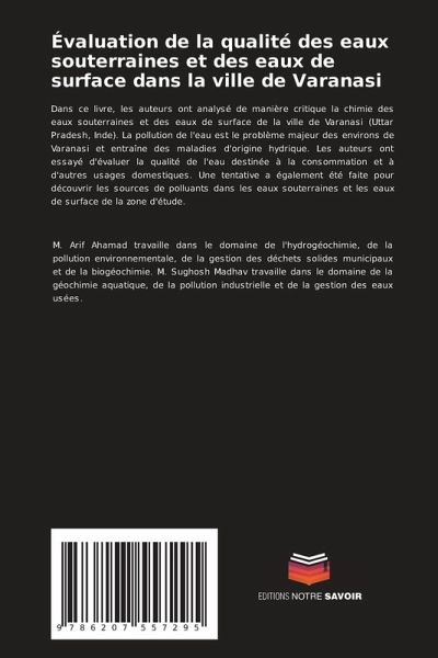 Dans ce livre, les auteurs ont analysé de manière critique la chimie des eaux souterraines et des eaux de surface de la ville de Varanasi (Uttar Pradesh, Inde). La pollution de l'eau est le problème majeur des environs de Varanasi et entraîne des maladies d'origine hydrique. Les auteurs ont essayé d'évaluer la qualité de l'eau destinée à la consommation et à d'autres usages domestiques. Une tentative a également été faite pour découvrir les sources de polluants dans les eaux souterraines et les eaux de surface de la zone d'étude.