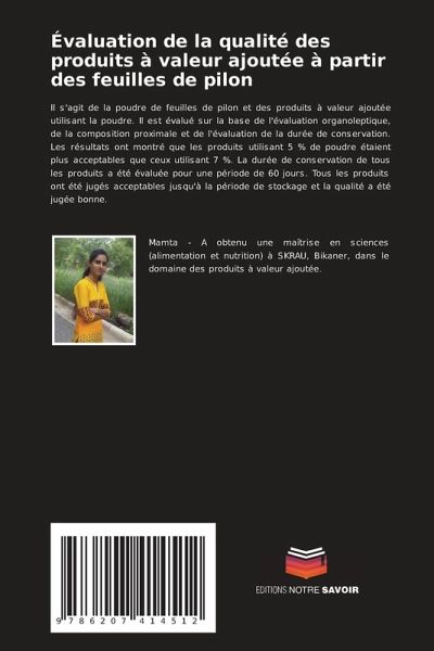 Il s'agit de la poudre de feuilles de pilon et des produits à valeur ajoutée utilisant la poudre. Il est évalué sur la base de l'évaluation organoleptique, de la composition proximale et de l'évaluation de la durée de conservation. Les résultats ont montré que les produits utilisant 5 % de poudre étaient plus acceptables que ceux utilisant 7 %. La durée de conservation de tous les produits a été évaluée pour une période de 60 jours. Tous les produits ont été jugés acceptables jusqu'à la période de stockage et la qualité a été jugée bonne.