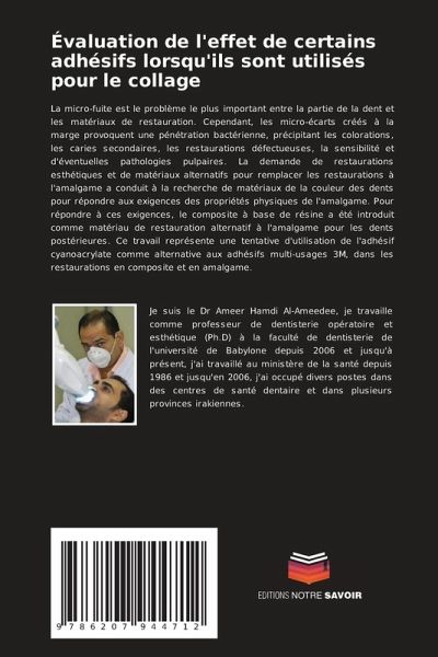 La micro-fuite est le problème le plus important entre la partie de la dent et les matériaux de restauration. Cependant, les micro-écarts créés à la marge provoquent une pénétration bactérienne, précipitant les colorations, les caries secondaires, les restaurations défectueuses, la sensibilité et d'éventuelles pathologies pulpaires. La demande de restaurations esthétiques et de matériaux alternatifs pour remplacer les restaurations à l'amalgame a conduit à la recherche de matériaux de la couleur des dents pour répondre aux exigences des propriétés physiques de l'amalgame. Pour répondre à ces exigences, le composite à base de résine a été introduit comme matériau de restauration alternatif à l'amalgame pour les dents postérieures. Ce travail représente une tentative d'utilisation de l'adhésif cyanoacrylate comme alternative aux adhésifs multi-usages 3M, dans les restaurations en composite et en amalgame.