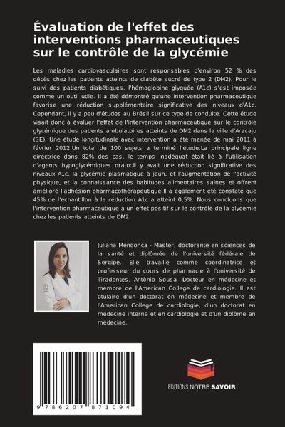 Les maladies cardiovasculaires sont responsables d'environ 52 % des décès chez les patients atteints de diabète sucré de type 2 (DM2). Pour le suivi des patients diabétiques, l'hémoglobine glyquée (A1c) s'est imposée comme un outil utile. Il a été démontré qu'une intervention pharmaceutique favorise une réduction supplémentaire significative des niveaux d'A1c. Cependant, il y a peu d'études au Brésil sur ce type de conduite. Cette étude visait donc à évaluer l'effet de l'intervention pharmaceutique sur le contrôle glycémique des patients ambulatoires atteints de DM2 dans la ville d'Aracaju (SE). Une étude longitudinale avec intervention a été menée de mai 2011 à février 2012.Un total de 100 sujets a terminé l'étude.La principale ligne directrice dans 82% des cas, le temps inadéquat était lié à l'utilisation d'agents hypoglycémiques oraux.Il y avait une réduction significative des niveaux A1c, la glycémie plasmatique à jeun, et l'augmentation de l'activité physique, et la connaissance des habitudes alimentaires saines et offrent amélioré l'adhésion pharmacothérapeutique.Il a également été constaté que 45% de l'échantillon à la réduction A1c a atteint 0,5%. Nous concluons que l'intervention pharmaceutique a un effet positif sur le contrôle de la glycémie chez les patients atteints de DM2.