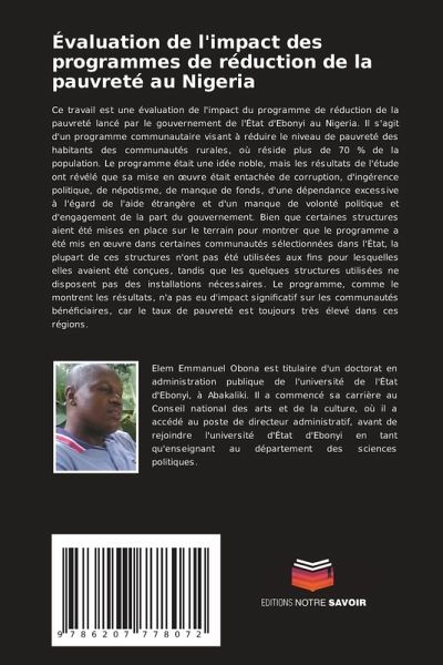 Ce travail est une évaluation de l'impact du programme de réduction de la pauvreté lancé par le gouvernement de l'État d'Ebonyi au Nigeria. Il s'agit d'un programme communautaire visant à réduire le niveau de pauvreté des habitants des communautés rurales, où réside plus de 70 % de la population. Le programme était une idée noble, mais les résultats de l'étude ont révélé que sa mise en oeuvre était entachée de corruption, d'ingérence politique, de népotisme, de manque de fonds, d'une dépendance excessive à l'égard de l'aide étrangère et d'un manque de volonté politique et d'engagement de la part du gouvernement. Bien que certaines structures aient été mises en place sur le terrain pour montrer que le programme a été mis en oeuvre dans certaines communautés sélectionnées dans l'État, la plupart de ces structures n'ont pas été utilisées aux fins pour lesquelles elles avaient été conçues, tandis que les quelques structures utilisées ne disposent pas des installations nécessaires. Le programme, comme le montrent les résultats, n'a pas eu d'impact significatif sur les communautés bénéficiaires, car le taux de pauvreté est toujours très élevé dans ces régions.