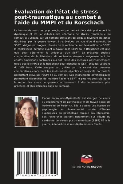 Le besoin de mesures psychologiques permettant de saisir pleinement la dynamique et les vicissitudes des réactions de stress traumatique au combat est urgent, car un nombre croissant de soldats revenant de zones déchirées par la guerre doivent être évalués en vue d'un diagnostic de SSPT. Malgré les progrès récents de la recherche sur l'évaluation du SSPT, la controverse persiste quant à savoir si le MMPI ou le Rorschach est plus utile pour déterminer la présence d'un SSPT. La présente analyse comparative de la littérature de recherche évaluera soigneusement les études empiriques contrôlées qui ont utilisé des mesures psychométriques telles que le MMPI/2 et le Rorschach pour identifier le SSPT chez les vétérans du Viêt Nam. Cette analyse est guidée par la rareté des données comparatives concernant les instruments objectifs et projectifs normalisés permettant d'évaluer l'ESPT lié au combat. Des instruments psychologiques permettant d'identifier de manière fiable le SSPT le plus tôt possible après le retour des zones de guerre contribueraient à des interventions plus précoces et plus efficaces dans ce domaine.