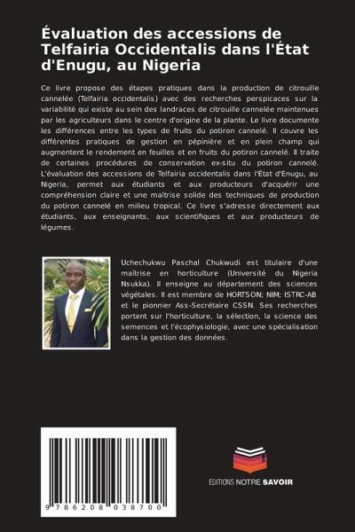 Ce livre propose des étapes pratiques dans la production de citrouille cannelée (Telfairia occidentalis) avec des recherches perspicaces sur la variabilité qui existe au sein des landraces de citrouille cannelée maintenues par les agriculteurs dans le centre d'origine de la plante. Le livre documente les différences entre les types de fruits du potiron cannelé. Il couvre les différentes pratiques de gestion en pépinière et en plein champ qui augmentent le rendement en feuilles et en fruits du potiron cannelé. Il traite de certaines procédures de conservation ex-situ du potiron cannelé. L'évaluation des accessions de Telfairia occidentalis dans l'État d'Enugu, au Nigeria, permet aux étudiants et aux producteurs d'acquérir une compréhension claire et une maîtrise solide des techniques de production du potiron cannelé en milieu tropical. Ce livre s'adresse directement aux étudiants, aux enseignants, aux scientifiques et aux producteurs de légumes.