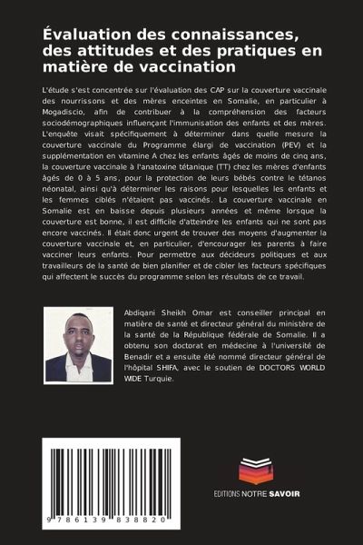 L'étude s'est concentrée sur l'évaluation des CAP sur la couverture vaccinale des nourrissons et des mères enceintes en Somalie, en particulier à Mogadiscio, afin de contribuer à la compréhension des facteurs sociodémographiques influençant l'immunisation des enfants et des mères. L'enquête visait spécifiquement à déterminer dans quelle mesure la couverture vaccinale du Programme élargi de vaccination (PEV) et la supplémentation en vitamine A chez les enfants âgés de moins de cinq ans, la couverture vaccinale à l'anatoxine tétanique (TT) chez les mères d'enfants âgés de 0 à 5 ans, pour la protection de leurs bébés contre le tétanos néonatal, ainsi qu'à déterminer les raisons pour lesquelles les enfants et les femmes ciblés n'étaient pas vaccinés. La couverture vaccinale en Somalie est en baisse depuis plusieurs années et même lorsque la couverture est bonne, il est difficile d'atteindre les enfants qui ne sont pas encore vaccinés. Il était donc urgent de trouver des moyens d'augmenter la couverture vaccinale et, en particulier, d'encourager les parents à faire vacciner leurs enfants. Pour permettre aux décideurs politiques et aux travailleurs de la santé de bien planifier et de cibler les facteurs spécifiques qui affectent le succès du programme selon les résultats de ce travail.