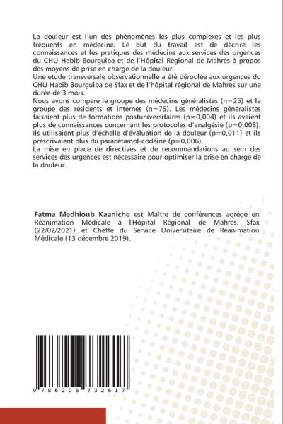 La douleur est l'un des phénomènes les plus complexes et les plus fréquents en médecine. Le but du travail est de décrire les connaissances et les pratiques des médecins aux services des urgences du CHU Habib Bourguiba et de l'Hôpital Régional de Mahres à propos des moyens de prise en charge de la douleur.Une etude transversale observationnelle a été déroulée aux urgences du CHU Habib Bourguiba de Sfax et de l'hôpital régional de Mahres sur une durée de 3 mois. Nous avons comparé le groupe des médecins généralistes (n=25) et le groupe des résidents et internes (n=75). Les médecins généralistes faisaient plus de formations postuniversitaires (p=0,004) et ils avaient plus de connaissances concernant les protocoles d'analgésie (p=0,008). Ils utilisaient plus d'échelle d'évaluation de la douleur (p=0,011) et ils prescrivaient plus du paracétamol-codéine (p=0,006).La mise en place de directives et de recommandations au sein des services des urgences est nécessaire pour optimiser la prise en charge de la douleur.