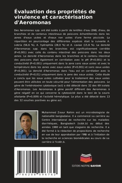 Des Aeromonas spp. ont été isolés à partir de lentilles d'eau (DW), d'eau, de branchies et de contenus intestinaux de poissons échantillonnés dans les zones d'eaux usées et d'eaux non usées d'une ferme piscicole. La répartition en pourcentage des différentes espèces était la suivante A. sobria (56,6 %), A. hydrophila (28,0 %) et A. caviae (15,8 %). La densité d'Aeromonas spp. dans les branchies est significativement corrélée (P<0,001) avec celle du contenu intestinal des poissons dans les deux zones. La densité d'Aeromonas dans les branchies et le contenu intestinal des poissons était également en corrélation avec le pH (P<0,001) et la conductivité (P<0,001) uniquement dans la zone sans eaux usées et avec la température dans les zones avec eaux usées (P<0,001) et sans eaux usées (P<0,001). La densité d'Aeromonas dans l'eau est en corrélation avec la conductivité (P<0,01) uniquement dans la zone des eaux usées. Cette étude a conclu que les eaux usées cultivées pour le traitement des eaux usées peuvent être utilisées en toute sécurité pour l'alimentation des poissons. Le gène de l'entérotoxine cytotoxique (act) a été détecté dans 32 des 69 isolats d'Aeromonas. Les Aeromonas à gène positif diffèrent des Aeromonas à gène négatif en ce qui concerne la cytotoxicité dans le test de la souris allaitante (P=0,009) et l'activité hémolytique. Le pilus a été détecté dans 13 des 32 souches positives au gène act.