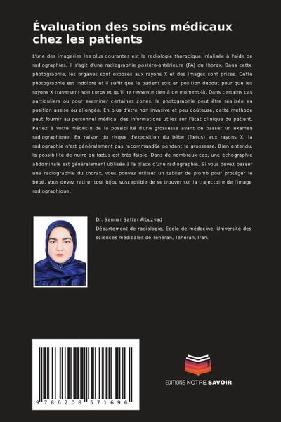 L'une des imageries les plus courantes est la radiologie thoracique, réalisée à l'aide de radiographies. Il s'agit d'une radiographie postéro-antérieure (PA) du thorax. Dans cette photographie, les organes sont exposés aux rayons X et des images sont prises. Cette photographie est indolore et il suffit que le patient soit en position debout pour que les rayons X traversent son corps et qu'il ne ressente rien à ce moment-là. Dans certains cas particuliers ou pour examiner certaines zones, la photographie peut être réalisée en position assise ou allongée. En plus d'être non invasive et peu coûteuse, cette méthode peut fournir au personnel médical des informations utiles sur l'état clinique du patient. Parlez à votre médecin de la possibilité d'une grossesse avant de passer un examen radiographique. En raison du risque d'exposition du bébé (foetus) aux rayons X, la radiographie n'est généralement pas recommandée pendant la grossesse. Bien entendu, la possibilité de nuire au foetus est très faible. Dans de nombreux cas, une échographie abdominale est généralement utilisée à la place d'une radiographie. Si vous devez passer une radiographie du thorax, vous pouvez utiliser un tablier de plomb pour protéger le bébé. Vous devez retirer tout bijou susceptible de se trouver sur la trajectoire de l'image radiographique.