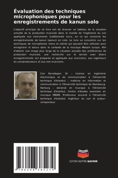 L'objectif principal de ce livre est de dresser un tableau de la situation actuelle de la production musicale dans le monde de l'ingénierie du son appliquée aux instruments traditionnels turcs, en ce qui concerne les enregistrements de kanun (qanun) en solo. Le livre se concentre sur les techniques de microphones mono et stéréo qui peuvent être utilisées pour enregistrer le kanun dans le contexte de la musique Makam turque. Afin d'obtenir une image plus large de la situation actuelle des préférences de production musicale, une recherche sur le terrain avec divers enregistrements est préparée et appliquée aux musiciens, aux ingénieurs du son/producteurs et aux non-musiciens.