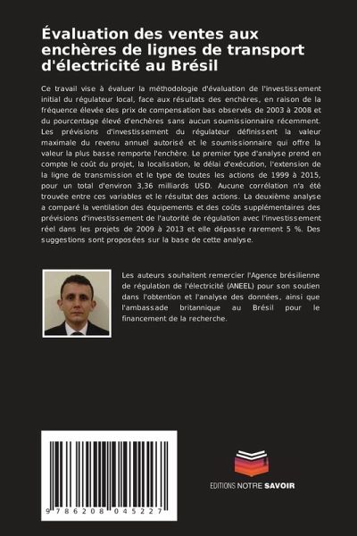 Ce travail vise à évaluer la méthodologie d'évaluation de l'investissement initial du régulateur local, face aux résultats des enchères, en raison de la fréquence élevée des prix de compensation bas observés de 2003 à 2008 et du pourcentage élevé d'enchères sans aucun soumissionnaire récemment. Les prévisions d'investissement du régulateur définissent la valeur maximale du revenu annuel autorisé et le soumissionnaire qui offre la valeur la plus basse remporte l'enchère. Le premier type d'analyse prend en compte le coût du projet, la localisation, le délai d'exécution, l'extension de la ligne de transmission et le type de toutes les actions de 1999 à 2015, pour un total d'environ 3,36 milliards USD. Aucune corrélation n'a été trouvée entre ces variables et le résultat des actions. La deuxième analyse a comparé la ventilation des équipements et des coûts supplémentaires des prévisions d'investissement de l'autorité de régulation avec l'investissement réel dans les projets de 2009 à 2013 et elle dépasse rarement 5 %. Des suggestions sont proposées sur la base de cette analyse.