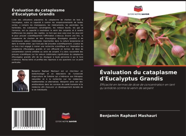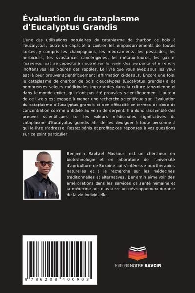 L'une des utilisations populaires du cataplasme de charbon de bois à l'eucalyptus, outre sa capacité à contrer les empoisonnements de toutes sortes, y compris les champignons, les médicaments, les pesticides, les herbicides, les substances cancérigènes, les métaux lourds, les gaz et l'essence, est sa capacité à neutraliser le venin des serpents et à rendre inoffensives les piqûres des reptiles. Le livre que vous avez sous les yeux est là pour prouver scientifiquement l'affirmation ci-dessus. Encore une fois, le cataplasme de charbon de bois d'eucalyptus (Eucalyptus grandis) a de nombreuses valeurs médicinales importantes dans la culture tanzanienne et dans le monde entier, qui n'ont pas été prouvées scientifiquement. L'auteur de ce livre s'est engagé à mener une recherche scientifique sur l'évaluation du cataplasme d'Eucalyptus grandis et son efficacité en termes de dose de concentration comme antidote au venin de serpent. Il a donc rassemblé des preuves scientifiques sur les valeurs médicinales significatives du cataplasme d'Eucalyptus grandis afin de les divulguer à toute personne à qui le livre s'adresse. Restez bénis et profitez des réponses à vos questions sur ce point particulier.