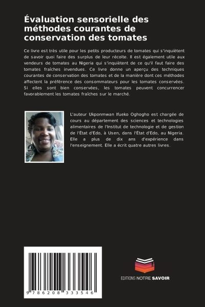 Ce livre est très utile pour les petits producteurs de tomates qui s'inquiètent de savoir quoi faire des surplus de leur récolte. Il est également utile aux vendeurs de tomates au Nigeria qui s'inquiètent de ce qu'il faut faire des tomates fraîches invendues. Ce livre donne un aperçu des techniques courantes de conservation des tomates et de la manière dont ces méthodes affectent la préférence des consommateurs pour les tomates conservées. Si elles sont bien conservées, les tomates peuvent concurrencer favorablement les tomates fraîches sur le marché.