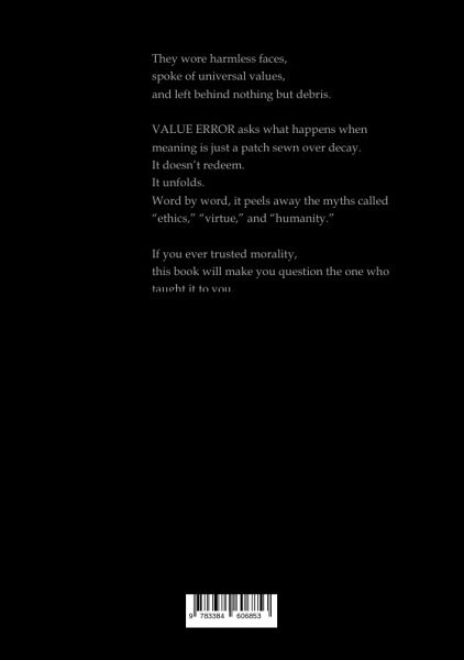 This book is a radical philosophical critique of universal values and ethics. With sharp, poetic precision, it dissects human nature, the illusion of morality, and the silence of death. Combining cosmological metaphors and social analysis, it reveals how universal ideals serve to mask cowardice, and how memory, death, and dignity collapse under ethical convenience. A book for readers ready to confront not the world, but themselves.------------------VALUE ERROR Why Universal Values Destroy Human Beings This is not a book that comforts. It is a declaration of human hatred-uncomfortably precise, mercilessly observed. With harmless faces, they tried to scrub the stench. But when they opened their mouths, fragments flew-red-hot or cold, depending on whose skin they touched. Morality became a tool to disguise cowardice. Universal values? Systems of emotional convenience, nothing more. Ethics wore civility like perfume over rot. Faith drifted-soft, unmeasured, weightless. And justice? It never crossed the heliopause. A human life is nothing but a thin membrane on spacetime: It inflates, bursts-and is forgotten. "Why Universal Values Destroy Human Beings" is not a metaphor.It is a fact.This book offers no hope. It observes-coldly, without pause-how the species called human betrays its own form. They turned from the flesh- from what they themselves had hollowed out. Their trajectories circled like shadows of imaginary numbers. Their mouths became tools for sealing lies. "Universality" reached nothing. "Philosophy" became the aesthetic of feigned emotion. Humans forgave themselves too easily. And so, too many lies were elevated into thought. VALUE ERROR is not about others. It is a quiet post-mortem on the species called "human." Every line I wrote tightened the ligature. And the more I wrote, the more I disliked being one. But if you are ready to doubt everything, begin here.