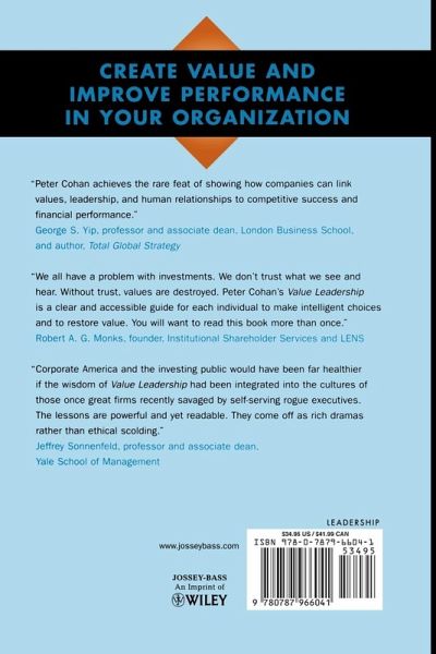 In Value Leadership, renowned management and investment expert Peter Cohan - whose 2002 stock picks gained 81percent when the S&P 500 plunged 24 percent- provides a new and powerful concept of sustainable corporate value. Using his expertise in understanding shareholder value, Cohan offers executives seven management principles that were tested in periods of economic expansion and contraction. These principles are: valuing human relationships, fostering teamwork, experimenting frugally, fulfilling your commitments, fighting complacency, winning through multiple means, and giving to your community. Cohan illustrates these principles by drawing on examples from eight Value Leaders- Synopsys, WalMart, Goldman Sachs, MBNA, Johnson & Johnson, J. M. Smucker, Southwest Airlines, and Microsoft. Through two recessions, these companies grew 35 percent faster, were 109 percent more profitable, and generated five times more shareholder wealth than their peers.