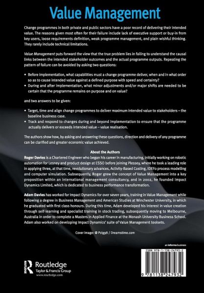 Change programmes in both private and public sectors have a poor record of delivering their intended value. The reasons given most often for their failure include lack of executive support or buy-in from key users, loose requirements definition, weak programme management, and plain wishful thinking. They rarely include technical limitations. Value Management puts forward the view that the true problem lies in failing to understand the causal links between the intended stakeholder outcomes and the actual programme outputs. Repeating the pattern of failure can be avoided by asking two questions: - Before implementation, what capabilities must a change programme deliver, when and in what order so as to cause intended value against a defined purpose with speed and certainty? - During and after implementation, what minor adjustments and/or major shifts are needed to be certain that the programme remains on purpose and on value? and two answers to be given: - Target, time and align change programmes to deliver maximum intended value to stakeholders - the baseline business case - track and respond to changes during and beyond implementation to ensure that the programme actually delivers or exceeds intended value - value realisation. The authors show how, by asking and answering these questions, direction and delivery of any programme can be clarified and greater economic value achieved.
