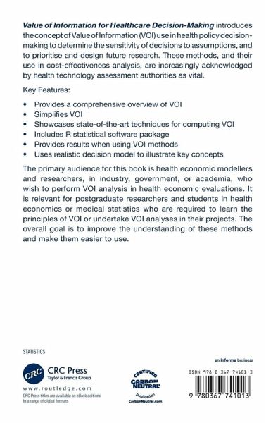 Key Features: Provides a comprehensive overview of VOISimplifies VOIShowcases state-of-the-art techniques for computing VOIIncludes R statistical software packageProvides results when using VOI methodsUses realistic decision model to illustrate key concepts The primary audience for this book is health economic modellers and researchers, in industry, government, or academia, who wish to perform VOI analysis in health economic evaluations. It is relevant for postgraduate researchers and students in health economics or medical statistics who are required to learn the principles of VOI or undertake VOI analyses in their projects. The overall goal is to improve the understanding of these methods and make them easier to use.